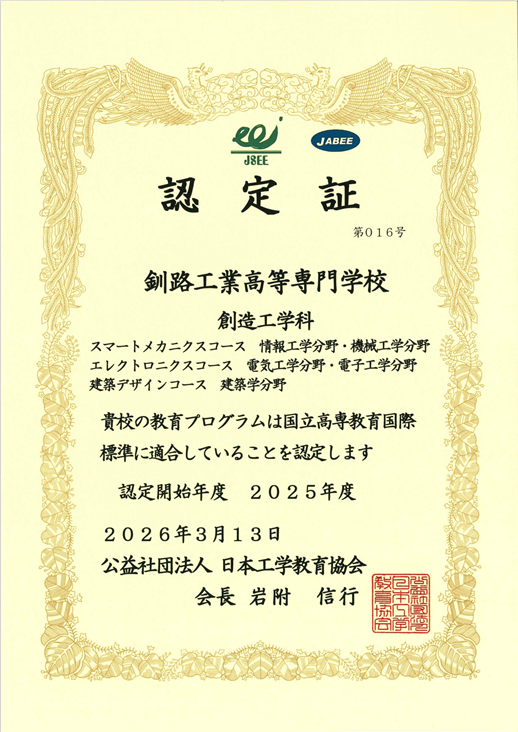 この制度は、工学教育の1つの柱である高等専門学校(高専)の5年間の本科教育に対して、国際的な教育の質保証の枠組みである「国立高専教育国際標準 (KOSEN International Standard:KIS) 」に基づく質保証を行うことで、高専の本科教育の質保証を国内外に対して明示することを目的に、2022年度に開始された認定制度です。 本校は2025年度に申請を行い、認定を受けています。